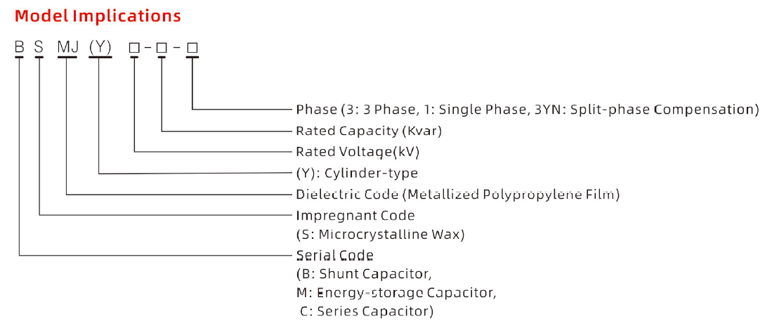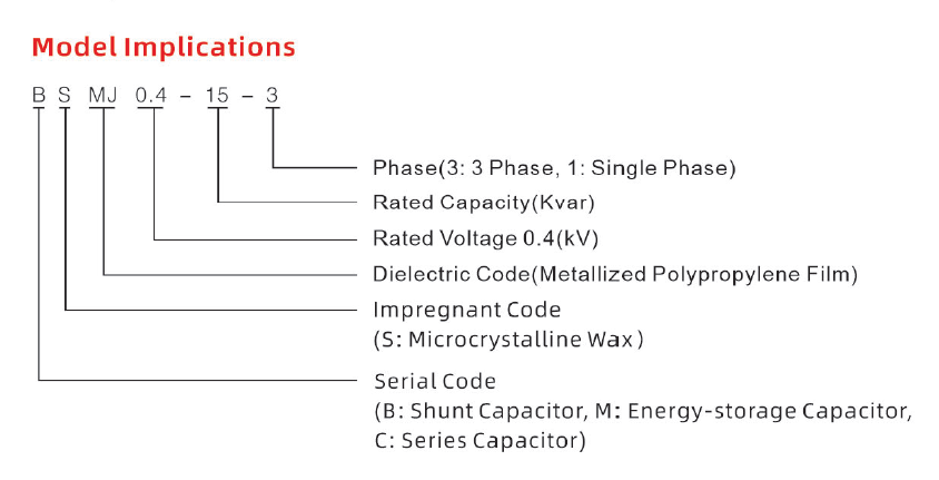 Míg a kínai nemzeti gépipari szabványok nem határozzák meg kifejezetten az alacsony feszültségű öngyógyító söntkondenzátorok sorozatának pontos megjelölését, szigorúan szabályozzák, hogy a gyártók hogyan nevezzenek el egy sorozat teljesítménykondenzátort betűelrendezéssel. A BSMJ egyszerűen egy általános teljesítménykondenzátor-sorozat, amely megfelel az ipari szabvány elnevezési szabályoknak.